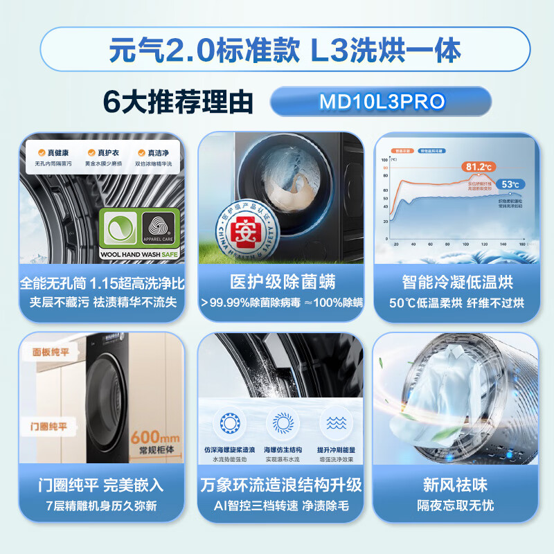 美的MD10L3PRO买家电还是要买大牌子的,看着舒服舒心,用着放心,售后有保障,特别是售后做的很好,送货师傅直接送到,且直接安装好,调试好,看着感觉不错,功能齐全哈,再多用用看效果咯。外形外观:漂亮洗净效果:不错容量大小:挺大超棒 第三次回购了 一共买了台 满意度高 职工宿舍超适合 大家都喜欢烘干功能 适合两广回南天 性价比高 推荐入手 不踩雷洗衣机小巧方便,买来给宝宝洗衣服的,功率大,大人的两套睡衣也能轻松洗。送货上门很方便!外形外观:很好看洗净效果:干净卫生除菌效果:蓝光除菌容量大小:很好用,洗的超级干净,还会再次购买,一次不错的购买体验