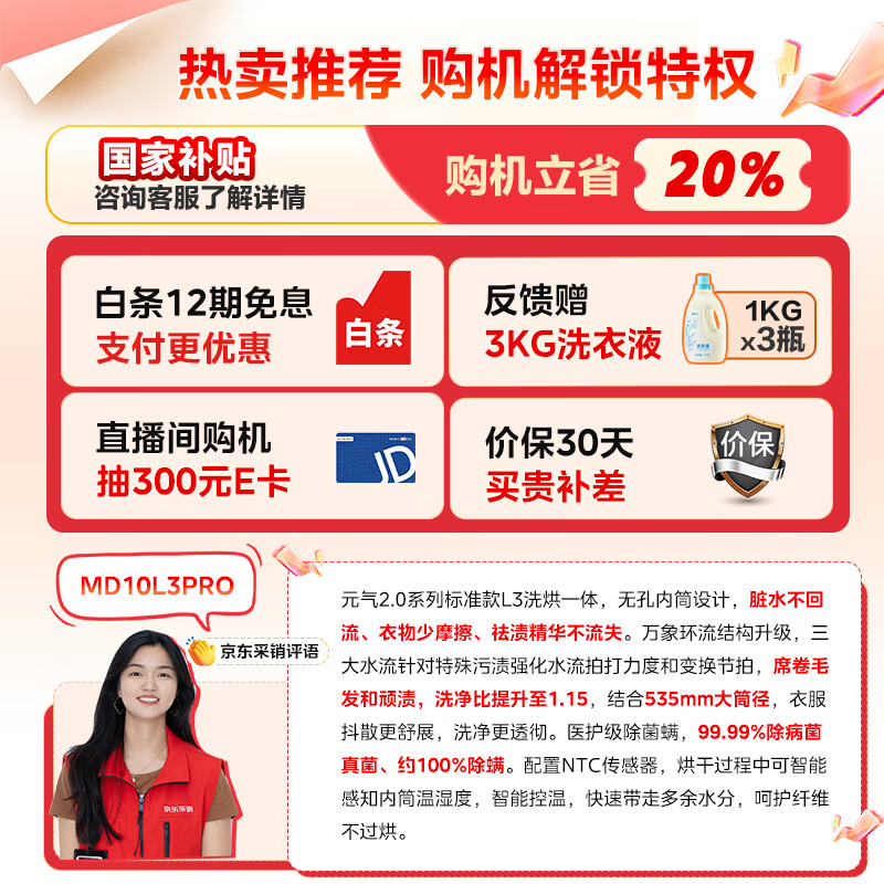 美的(Midea)滚筒洗衣机全自动家用 MD10L3PRO 10公斤洗烘一体纯平全嵌 1.15洗净比 元气2.0 以旧换新 到手价格3299元。