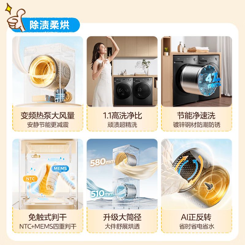 美的(Midea)洗烘套装 10KG滚筒洗衣机+变频热泵烘干机 1.1洗净比 MG100V36T+VH36T 以旧换新 家电国家补贴到手价格4698元。