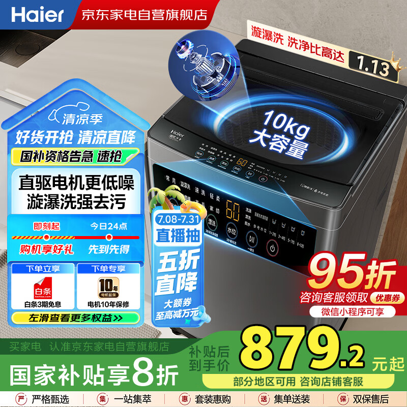 海尔(Haier)全自动波轮洗衣机10公斤直驱变频一级 省水省电 家用大容量 线下同款 国家补贴20%XQB100-BZ608到手价格1149元。