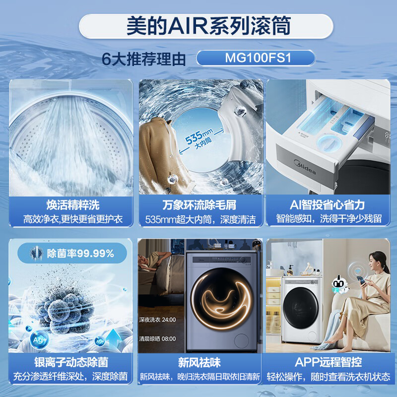 美的MG100FS1收到货有两三天了,洗了一次被子和衣服都洗的很干净,声音不是很大,可以接受,老品牌还是值得信任,推荐给朋友了再入手一台用了一段时间才来评价,质优价廉美观大方,很实用,足够洗一家人的衣服,再也不用手洗都干洗快递很快,隔天就到了,的洗衣机颜值特别高,客服态度也非常好,我看的这款功能也比较多,目前还没有使用,等使用后再继续好评这款洗衣机太棒啦!大容量,洗烘一体,还有家电补贴,功能齐全,强力风干等,真好用,好评!一分钱一分货,还行吧,比同档次的要好一些,外观颜色也可以,反正这些用个三五几年也是没问题的,一次愉快的购物,值得推介购买