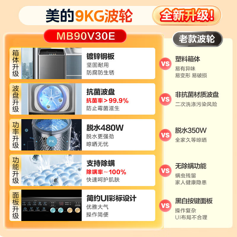美的(Midea)波轮洗衣机全自动家用 MB90V30E 9公斤 洗衣机排名前十名 抗菌除螨 以旧换新 家电国家补贴到手价格689元。