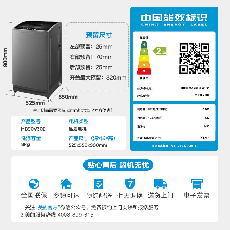 我买的这款洗衣机洗衣粉不能完全冲不到滚筒里 、好多都停留到观察门里面的塑料上,衣服洗完了还在上面冲不掉,设计有问题。洗衣机送到了,师傅态度很好。洗衣机挺漂亮的。喜欢。一级能耗省电。老品牌了,值得信任。洗衣机美的MB90V30E,老品牌,老妈极力推荐的一款大容量洗衣机,颜值也不错。京东送货及时,下着大雪快递小哥送货上门,放到指定位置,必须好评!非常满意的一次购物,这款洗衣机洗衣服特别的干净,送货速度也很快,双十一购买的价格很划算不愧是家电老品牌,质量没的说.容量够大,衣服洗的非常干净,脱水声音不大,使用方便,字大,安装挺快的,物流也快,五星好评。