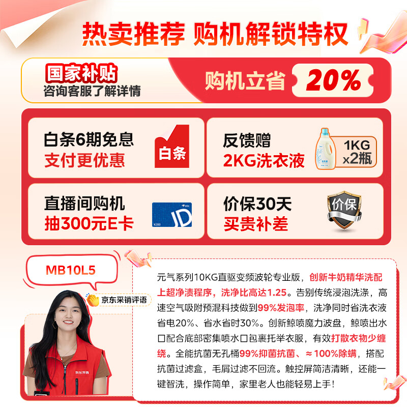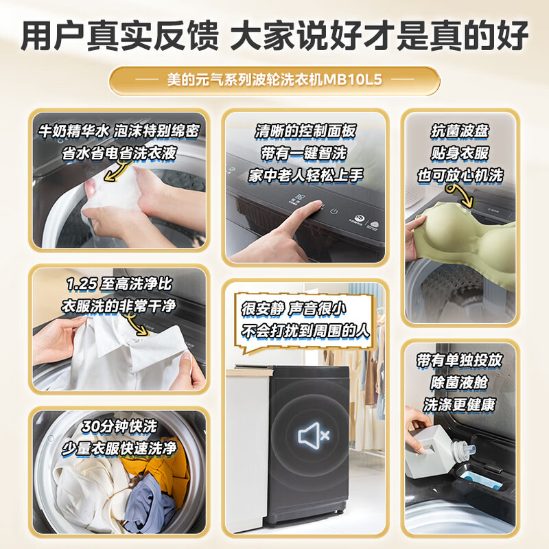 洗衣机美的MB10L5哪个好?有啥区别?其实这款美的(Midea)波轮洗衣机全自动家用 MB10L5 10公斤 1.25至高洗净比 元气精华洗 变频 以旧换新 家电国家补贴20%蛮不错的哈,精美的设计和外观,做工讲究,有一些网友想要了解这个美的MB10L5怎么样?做工如何?说实在的这个洗衣机美的MB10L5使用体验后个人感觉确实可以的哈,刚入手不久的,实用,给两个好评,正是为我家量身定制的嘛,运输速度也太快了吧,不要犹豫了价格实惠,外观很不错,做工精致,磨砂质感,非常喜欢,颜值和实力相当给力,产品质量好,果断好评啦咯啦咯啦咯,智能抑菌和节能省电,非常好,用了很久,东西很好,外观好看,外观很满意。外观小巧细巧,会推荐家人朋友在京东购物, 洗衣机美的MB10L5了解过这款的洗烘套装。首先公斤数可以达到家里的使用需求,外观也可以,正好想要买一款白色的洗烘套装。待安装使用后再追评 货收到,挺好的,物流也快,小哥太度好,维修师傅很尽责,洗衣机质量很好,值得信赖,谢谢了… 客服非常热情,给我介绍这款洗衣机的优点,配送非常及时,售后安装按照预约了的时间提前到来,安装、调试好后,然后教我们使用。 都在网上看好尺寸了,按尺寸购买的,到了以后正好,外观经典,送货快,东西好用,洗的干净