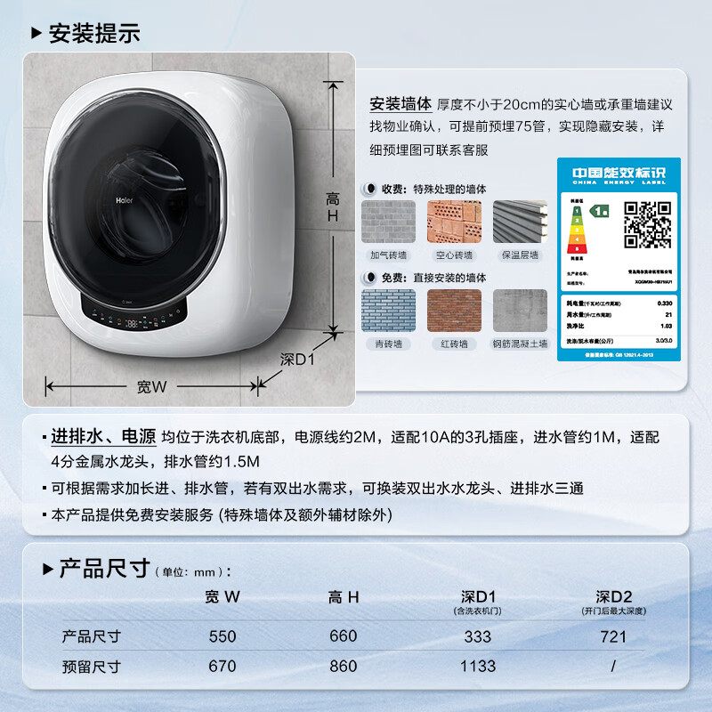 洗衣机海尔XQGM30-HB715U1哪个好?区别是?这款海尔(Haier)洗衣机小型全自动 内衣婴儿懒人洗衣机 壁挂洗烘一体家用 3KG除菌螨 国家补贴20% 一级能效云溪715的确是蛮可以的哈,巧妙的外观设计风格,做工讲究,不少的人想要了解这款海尔XQGM30-HB715U1怎么样?谁用过评价?说真心话这洗衣机海尔XQGM30-HB715U1使用过一段时间后个人觉得可以的哈,才买没多久的,亲戚介绍买这个牌子的洗衣机,刚好有活动就毫不犹豫的选择了这款。物流非常快,当天就发货了,第二天安装师傅就上门了,时间观念很强,说好几点到就几点到,师傅技术很娴熟,态度非常好,还现场演示解说一些基本功能。超喜欢这台洗衣机,运行时非常安静,因为太安静还以为没启动,以致视频拍了三次,哈哈哈… 洗衣机海尔XQGM30-HB715U1价格很划算,质量也很不错,很大的一款洗衣机,在京东购物很放心,价格也很实惠,期待有更多的优惠,送货也很方便,包装很结实。 洗衣机收到了,物流很快,质量很好,物美价廉,容量大小也合适,解放双手,需要的可以购买 洗衣机自己装的,技术不精,震动厉害,然后找客服,安装师傅很热情预约上门安装,很快就搞定了,洗衣机洗的很干净,噪音很小 洗衣机不错哦,衣服洗的干净,洗大的床单被罩都没问题,客服和物流都很给力?推荐大家购买