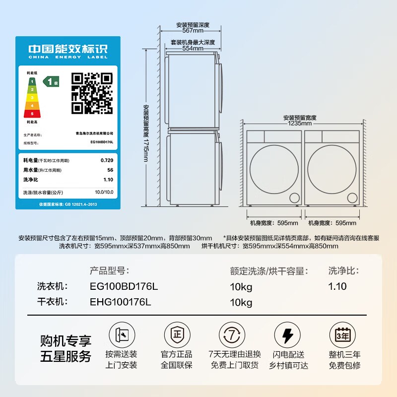 海尔EG100BD176L外形外观:薄款,刚好可以放进我们家的洗手台,颜值挺高,灰色比较高级洗净效果:衣服洗的很干净容量大小:容量大,全家衣服够用新买的十公斤洗烘一体的洗衣机,一装上,立马开机洗衣服,洗衣体检真不错,声音小,运转平稳!洗衣机很重质感也可以,颜色也可以,小桶基本是-双袜子的空间,还没有开始用,等用了再来反馈,就是我买的时候多,才几天就多了东西不错,洗衣效果很好,智能洗涤功能特别实用,操作简单,省时省力,真是家里必备的好帮手。外形外观:非常好看,高大上洗净效果:还没洗,洗了再评价除菌效果:还没用,看介绍很满意容量大小:够大,洗衣服和被子都可以