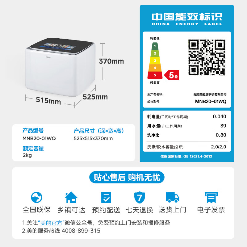 美的洗衣机MNB20-01WQ洗衣机真不错哦,师傅安装好试验了一下,挺静音的,大容量可以洗被子啦!换季洗的衣服也多,正好趁着国补搞掂它,真心不错!收到货后,商家很贴心,及时按排售后和送货上门的师傅同时到位进行按装调试和指导,谢谢!收到货就用了,洗了洗我的白色羽绒服个人感觉洗的效果不错,声音不是很大能接受,烘干的效果也是杠杠的,外观颜色很大气,喜欢!洗衣机外观好看,小巧,不占地方,洗衣服很干净,适合一家三口使用,物美廉价,值得购买。专门洗衣服洗内衣用,因为外准备有烘干机所以只需要洗净功能,一个月用下来感觉非常好,特别适合内衣单独洗,不占空间,使用方便