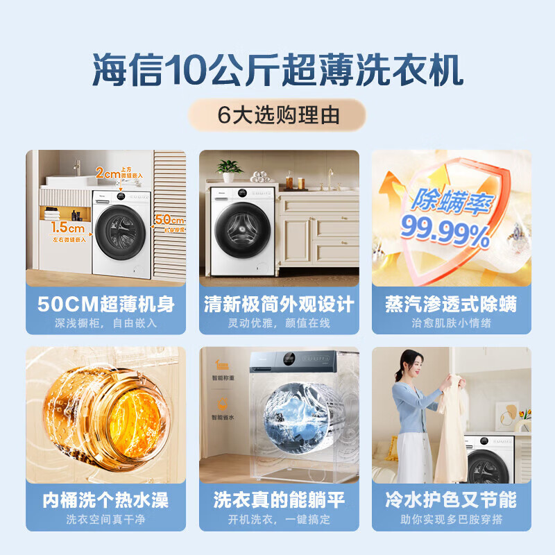 海信(Hisense)10公斤滚筒洗衣机全自动家用大容量50CM超薄机身变频1.10高洗净比家电国家补贴20%以旧换新HG10JE1到手价格1199元。