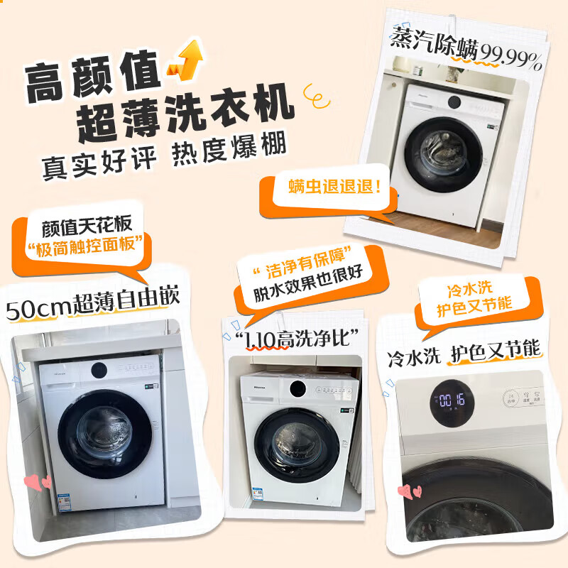 海信HG10JE1意外之喜啊,一千出头就能买到这洗衣机。工作容量充足!刚到家就立马试用了,超级静音,水量可调,一级能源省电省水。太棒了?洗衣机收到后很惊喜,机身小巧轻便,试用后衣服洗的干净,而且声音特别小,值得推荐,好评品牌 洗衣机超赞!外观简约时尚,容量大且分区合理。洗衣过程超静音,洗得超干净,脱水效果也好,智能操控超便捷,真心推荐!买来洗宝贝的衣服,不太占地方,玻璃盖板颜值挺高的,装好目测放件薄款连体衣一起洗空间足够。洗衣机收到了,用了几天才来评价的。外观,价格都很满意,无异味,洗的也很干净,容量也很好,适合个人用。很满意的一次购物