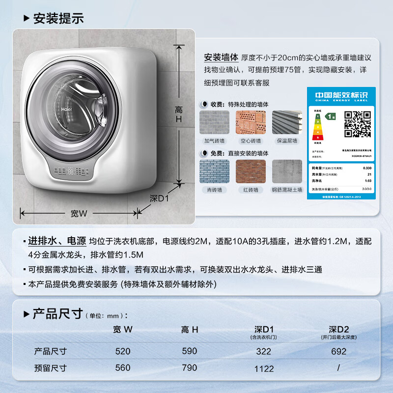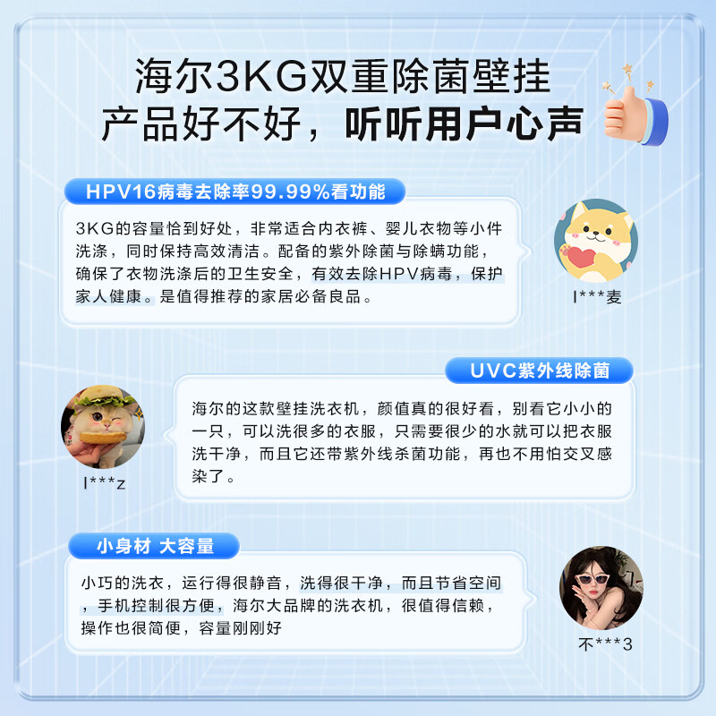 洗衣机海尔XQGM30-B70AU1哪个好?区别是什么?实际上这款海尔(Haier)洗衣机小型全自动 懒人内衣裤婴儿儿童洗衣机 壁挂洗衣机 3KG除HPV 国家补贴20% 一级能效B70AU1的确蛮可以的,完美的外观设计风格,做工十分讲究,很多朋友有疑问这海尔XQGM30-B70AU1怎么样?值得入手吗?说真心的这洗衣机海尔XQGM30-B70AU1使用体验后个人感觉可以的,我自己也是才购买不久的,家里旧的洗衣机用了十多年,质量好的从来没维修过,这次趁有国补以旧换新可以八折优惠换新的洗衣机,毫不犹豫还是选择的,选中的这款滚筒洗衣机,电机是的 ,洗涤容量公斤,洗净比.银色外观看着干净清爽,昨天安装好后洗了一次小被子,一次衣服,洗衣过程噪音不大,洗的很干净,洗衣机果然还是那么的好! 洗衣机海尔XQGM30-B70AU1非常不错三百块合适了,因为房东各种扯皮不给换洗衣机,这个价位刚刚好还能分期免息,衣服洗的干净快,新的也干净,真的很值 外观挺大气,特意用了才来评价,洗的挺赶紧的容量也挺大的,声音噪音很低,性价比高,值得购买 体型小巧,不占地,平时洗点小件衣服很方便,噪音小,洗衣桶一次能洗三件成人男士恤,洗得干净,甩干功能也很给力,甩的干净 洗衣机价格实惠,外观简单,一直信赖洗衣机,安装师傅也很细心,给家里长辈购买,非常合适。