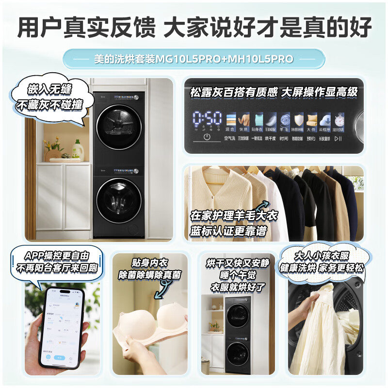 洗衣机美的MG10L5PRO哪个好?区别有没有?实际上这个美的(Midea)元气2.0洗烘套装 10KG滚筒洗衣机+变频热泵烘干机 智能投放 纯平全嵌 MG10L5PRO+L5PRO 国家补贴确实是非常OK的,硬朗的设计造型,做工蛮讲究的,有一些网友想要了解这个美的MG10L5PRO怎么样?好不好用?说实话这洗衣机美的MG10L5PRO使用体验后个人感觉可以的哟,才买不久的,越来越喜欢京东自营的东西了,赶上了国补价格很优惠,同时京东的物流也很给力 使用了好几次来评价的,特别方便,把衣服放进去后,人在外都能远程控制机器,声音也不是很大,主要烘干机是真的不错除毛效果不错,每次烘干后能把衣服上的猫毛去掉,加上透视烘干功能可以试试观察衣服烘干情况,整体很满意,品质之选 洗衣机美的MG10L5PRO的这款洗衣机,小巧玲珑,真的适合洗一个小孩的衣服,价格还可以,质量有保证,京东自营,包安装,不用自己动手,物流速度很快! 尺寸刚刚好。洗净效果:很干净,除菌效果:效果明显,容量大小:容量大。外形外观:很时尚。 外形外观:简单,好打理洗净效果:试过了,不错,声音也不大除菌效果:期待下次,除菌螨洗容量大小:品牌,值得购买,放心用 外形外观:特别好洗净效果:洗的也特别干净除菌效果:特别好容量大小:可以一下洗整套四件套