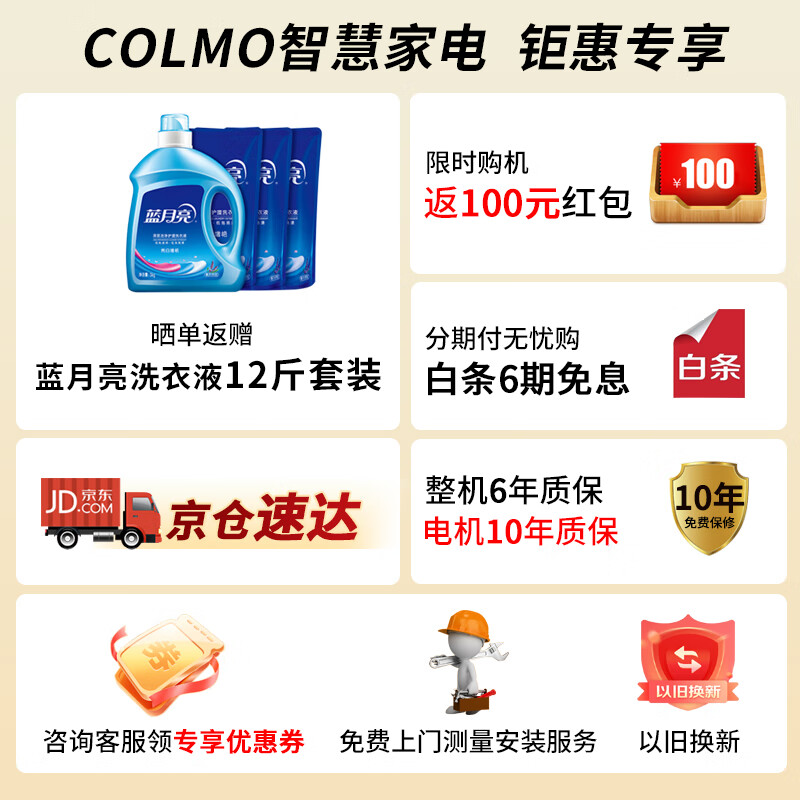 给家里人买的,配送和安装都很快,整体还是很满意的,外观不错,使用时有声音但在接受范围之内,后期看使用情况再来反馈情况。外形外观:漂亮大气美丽动人洗净效果:洗的特别棒干净卫生除菌效果:很好容量大小:很大很合适洗衣机COLMOCGU10W-HS1K颜值很高,双十一活动价格购买的,超实惠,价格亲民,重点洗的干净,这个价位的滚筒,还是的性价比高,质量靠谱,值得购买。看了很久喜欢的你终于到家了,外观很大气,用着很方便,声音小,带蓝光,很满意的洗衣机。容量大小:公斤的家庭用非常合适外形外观:外观好看洗净效果:还没使用,但是相信品牌配合国补价格非常合适,店里都买不到的价格