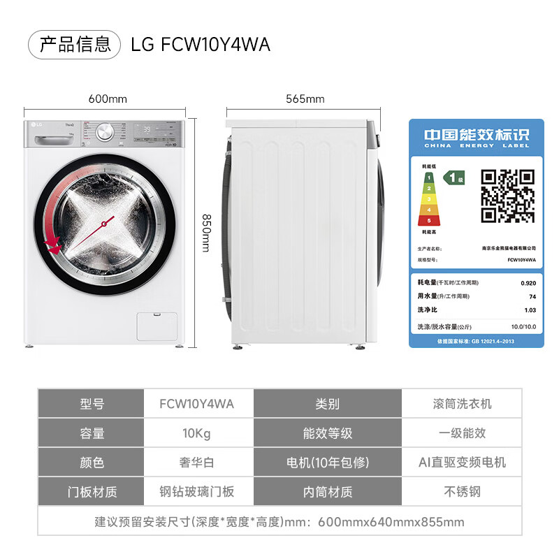 LGFCW10Y4WA商品收到咯,特别喜欢,一收到就迫不及待地打开了,家人也很满意,这次购物体验不错,还给送到村子里 真的很棒,不用取了!比之前洗衣机大好多,一个人移动洗衣服不太方便,今天试了试衣服洗的还可以,整体感觉很不错价格便宜,免费安装,师傅来很快就装好了,洗衣机虽然小但是该有的功能都有,还有高温杀菌功能,可以洗袜子内裤等小件衣物,不错。这是第三次购买了,外形外观:简洁大方洗净效果:特别干净除菌效果:特别好容量大小:合适全自动洗衣机.公斤的非常好用。洗衣服省心又省电,噪音很小、甩起来又不抖动。帮媳妇解放双手。快递小哥直接送货到家门口。