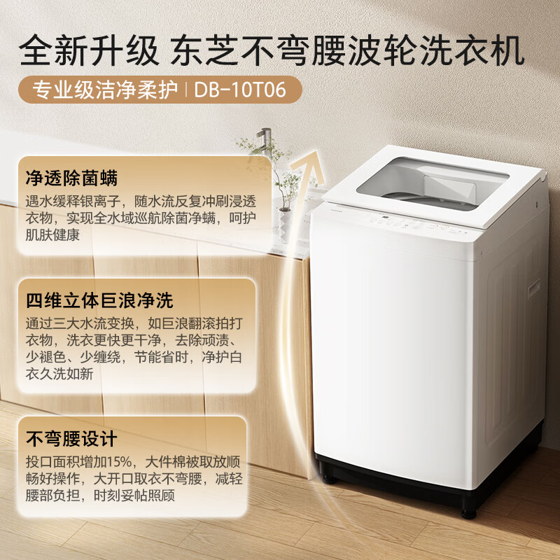 东芝(TOSHIBA)波轮洗衣机全自动 DB-10T06 10公斤大容量 白色 不弯腰 宿舍 租房神器 以旧换新 家电国家补贴到手价格1299元。
