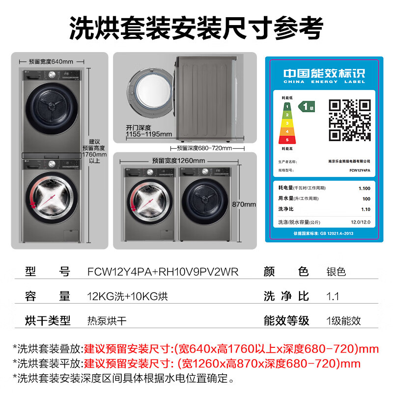 洗衣机LGFCW12Y4PA哪个好?区别大吗?其实这个LG小旋风MAX洗烘套装 12kg滚筒洗衣机+10kg双变频烘干机 FCW12Y4PA+RH10V9PV2WR银 国家补贴以旧换新的确是蛮可以的哟,设计造型无与伦比,做工还真挺细腻的,有些朋友有疑问这LGFCW12Y4PA怎么样?评测好吗?说实话这款洗衣机LGFCW12Y4PA已经使用过一段时间个人感觉蛮可以 的哈,我自己也是才购没多久的,外形外观:全触彩屏,操作很方便,钢化玻璃防烫罩,外观设计大方好看,一目了然,清晰自然。洗净效果:支持冷水洗涤,洗衣服干净利落放心,物理去污干干净净的。除菌效果:阴离子杀菌,等效去菌,我觉得挺干净。容量大小:公斤洗,公斤烘干..... 能自动添加洗涤剂柔顺剂真心好,比自己放好多了 洗衣机LGFCW12Y4PA这款洗衣机性价比很高,外观很漂亮,是我经过深思熟虑之后再购买的非常值得推荐洗衣服,洗得很干净,而且容量很大很好,很不错。 上一台洗衣机用了十年了,这一台再续上。操作简单,很适合父母使用,声音也不会,总体满意。 几年前给父母买过一款洗衣机,按键设置比较麻烦,因为他们年龄大了,用起来不顺手,这次果断换,便捷,而且清洁效果也是非常好! 洗衣机装好了,师傅人很好,物流也很快,师傅试了一下很静音,性价比高,推荐购买,必须好评.