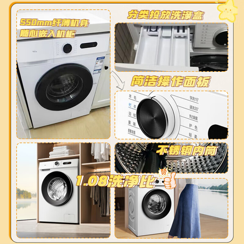 这款牌洗衣机,收到货后即用,它声音静小,操作简单,使用方便,洗衣很洁净,有除菌效果,小身材大容量,且性价比高,值得拥有!很好的一次购物体验,洗衣机很不错,价格合理功能齐全,清洗噪音很小!外形外观:外观时尚洗衣机TCLG100L110-HB九公斤超薄滚筒洗衣机收到了,外形设计美观大气,这款尺寸规格刚好适合我的洗衣机位置,刚安装好还没用,等用过以后再来评价。这洗衣机简直是福音。体积小巧不占地,操作简单易上手,洗衣高效还省水,日常使用超省心。洗衣机收到,实物比网上图片看着颜值高,到货完整,没有问题。安装也及时,第二天就给安了,并试上下水,没毛病。期待使用效果。