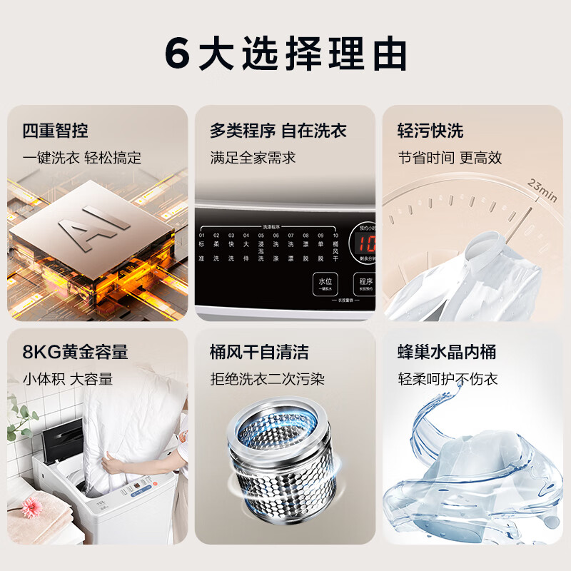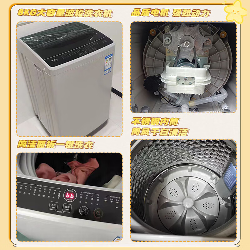 挺不错的颜值超高,安装的师傅很有耐心讲解用法,选这款果然没错,的品牌也值得信任非常好,用起来也没有什么噪音,挺不错的大小正合适,比较薄,放进去后面还有管线的空间,外观也很漂亮,功能齐全,满足各种使用需求!洗衣机TCLB80L100很多人都推荐这款洗衣机,趁着活动入手啦,很划算,也推荐给更多的新生儿家庭,很不错哦,外观精致,功能齐全容量大小:合适挺小巧,声音也不算大,脱水也很稳,不像以前的晃动,非常适合。容量大小:合适外形外观:很好家里好多年前买过洗衣机一直用的挺好的,声音小,质量更是没话说,大牌子必竞放心一点,这次新房装修还买的,加上国补价格也不高