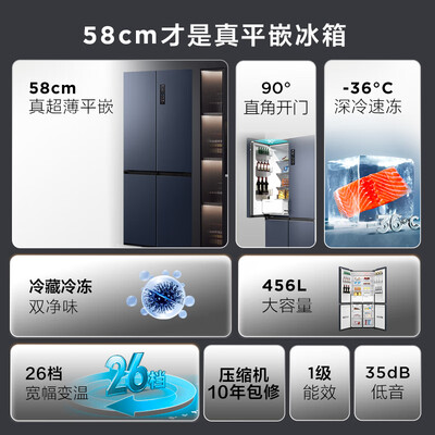 TCL大无界456升T9十字四开门58cm超薄平嵌入式底部散热双净味电冰箱国家补贴风冷一级能效R456T9-UQ目前活动价:2399.2元!
