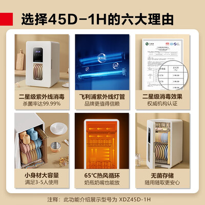 德玛仕(DEMASHI)XDZ45D-3Z东西很漂亮,容量的话,一家五口人的日常是足够了。已经使用,语音功能很好用,消毒柜台面放置,不占地方,颜值很高。容量很大,颜值也很高,不错很满意,空机运行了两次,感觉没有什么味道。选了很久才确定的这个款样式很好看比较小巧适合三口之家使用