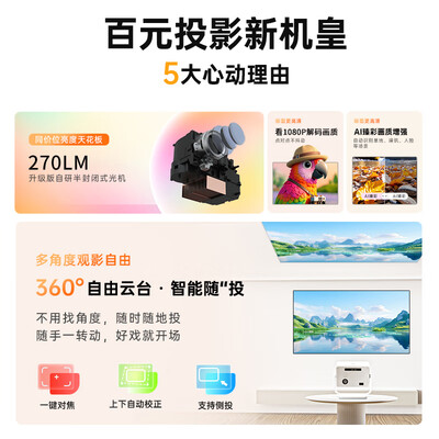 康佳(KONKA)H4pro云台版 投影仪家用便捷智能投影机卧室投影(上下自动梯形校正 电动对焦 家庭影院)目前活动价:449.1元!