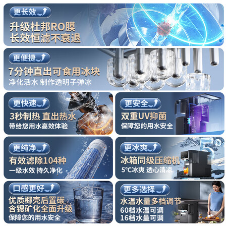 水干净,有白色漂浮物说正常,滤芯寿命使用后追评,出水还算快,安装不费事,还不错,妈妈很喜欢,比较方便!如有需要还会再回购。颜值很高,机器很有质感,做工很棒,纯水口感一流,感觉很滑很润,还有一丝丝甜,跟瓶装矿泉水口感相似,制水和出水时稍微有些声音,能接受,用一段时间继续看。外观很不错, 没有花里胡哨的, 看着很舒服, 质感很 好, 容易拔作易懂, 有长非小孩的家庭也容易接受 出 水不算慢, 制冷令制热速度很快, 暂时的体验感不错