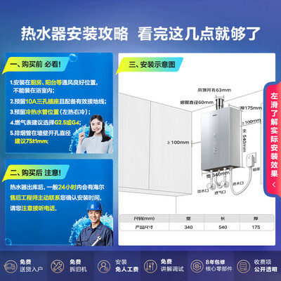 使用方便,有10/12/13升切换,外观美观大方;送货速度超快,晚上下单、第二天早上到。海尔清氧E7PRO燃气热水器燃气 天然气 变频恒温厨房卫生间强排式 智能变升防冻 水气双调海尔清氧E7PRO的这款热水器操作简单,水温稳定,安装师傅技术娴熟,很有耐心,满意!挺好看到,也蛮好用,安装师傅很负责,想尽办法把出气口安装漂亮热水器用了好几天了才来评价的,收到货之后就申请安装了,装修师傅很细心的教你怎么用,水温控制到多少,很满意
