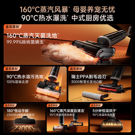 第一次买洗地机 也是朋友介绍追觅这个牌子 看图片的效果吧 拖一次就地面反光 好产品!(第一次使用 开机一放拖把就自动往前走 方便快捷 )刚拆箱还有50%的电量也拖好100平的房子 感觉满电可以用2-3次 机器工作时操音也不是大(我开了智能模式) 个人完全接受 非常满意!让家人告别费力清洁,地面常保洁净如新。追觅H40 Steam洗地机采用160℃蒸汽风暴洗地技术,深层除菌螨,母婴养宠无忧;同时,90℃热水溶污洗地功能,确保100%去油污,并能除菌除病毒,是中式厨房的理想选择。它不仅减轻了您的家务负担,也让
