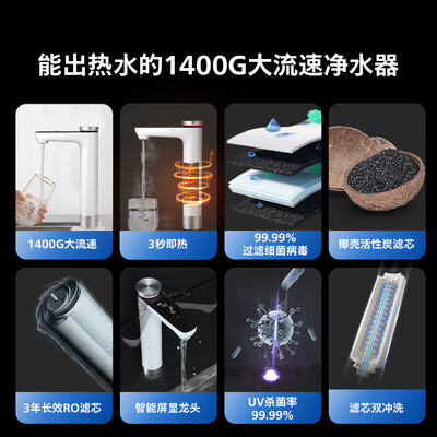 出水速度:很快 做了很多攻略才入手的静音效果:非常好外形设计:简单 白色配家里的颜色刚刚好使用很方便,完美结合了俩功能,出水速度也很快,热水出水会等几秒钟,但是完全不影响使用体验非常的完美了 很喜欢 没买错 以后家里人需要 还会继续推荐这个的 真的挺好用安装很简单,无需插电,不知道效果怎么样,应该是可以过滤很多颗粒和大分子物质的。之前也用的飞利浦净水器AUT7003净水器,年限久了,淘汰了,现在仍然用它家的,质量很好,使用方便?