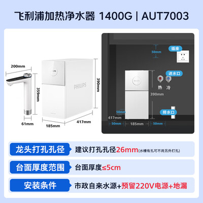 飞利浦(PHILIPS)1400G流速加热净水器 家用常温水3.7L/min RO反渗透净水机 即热龙头净水器AUT7003【国家补贴】目前活动价:1999元!