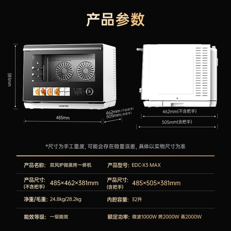 选了很久最终买了这款,确实不错,加热食物很快,功率也足够,操作简单方便,适合家庭使用。颜值质感在线,双风炉升温快,多模式满足多样需求,操作简单高效,厨房必备好物。特意用了一段时间,各种功能都挺好的。微波也很方便,蒸的功能也不错。还有导管可以保护柜子。推荐!