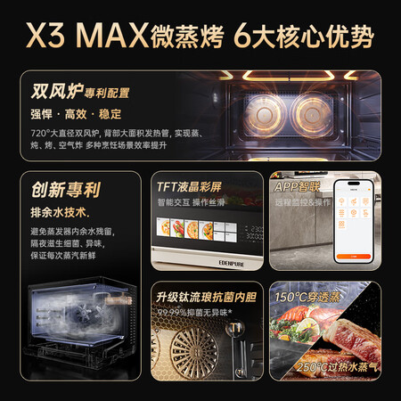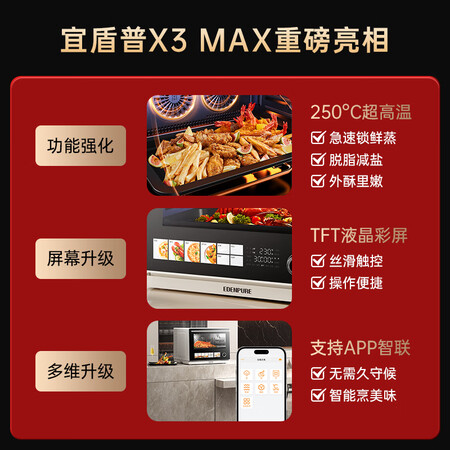 这两个宜盾普X3Max和X3升级款区别还是有的哈,经过比较后我订是宜盾普X3Max,这个宜盾普X3Max要新些还不错,整体看着非常精致,说实话这个宜盾普(EdenPURE)微蒸烤炸一体机微波炉蒸烤箱家用蒸烤一体台式32L大容量微蒸烤X3Max一级能效国家补贴的确蛮可以的,做工十分讲究,我自己也是才购买没多久的,趁着双十一活动,把用了8年的老烤箱以旧换新成这款蒸烤炸炖一体机,可真是太香了,收货后按客服提示空烤了几分钟用干净湿抹布擦净机器内腔和管路。特地使用了几天才来评价。功能多样:它代替了我的蒸锅、烤箱、空气炸锅、微波炉,甚至可以一锅出几个菜,只是刚开始使用对调节按钮还不太熟练,经过多次磨合更顺手了目前我使用最多的功能是微波热奶、咖啡,蒸馒头包子玉米红薯,蒸鱼,蒸菜,蒸蛋,烤炸用的相对少一些,还可以蒸汽消毒,目前对机器功能上整体很满意。