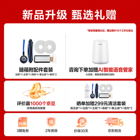 海尔宠爱V40与小白V30哪个好?有区别没有?海尔宠爱V40买来送人的,还没用,希望好用~比较新的型号,*元级别的价格,本来想选其他品牌,但印象比较早,吸力挺大的,所以试试。挺不错的,清扫能力强,现在可以解放双手了,非常方便,也不用去换水,很智能,会自动避开障碍物和楼梯,非常好,客服态度也好!很好?商品收到了,包装得很好,物流非常快,客服态度很积极,有问题及时解答!总体来说非常满意!趁着活动赶紧下手啦,精挑万选还是选择了这个牌子,太划算啦,还有赠品哦,还在观望的赶紧下手够买!自动清洗拖布,出舱都很顺利,声音也还能接受。目前能解决大部分的清洁,不沾毛发!不沾毛发!这个功能超级爱!小坡度高度也能爬!