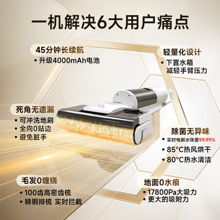 优点是比拖把好用,不用总是来回洗拖把了,家里125平,每天用足够用了。拖完还算干净的吧。我要求不算高。基础垃圾都能吸进去,我家两个女宝宝,地面头发比较多吧,不缠头发蛮好 这款真的很好用!强劲吸力,轻松搞定各种灰尘和毛发。关键是续航也很棒,一次充电可以打扫家里的每一个角落。推荐给所有爱干净的小伙伴们
