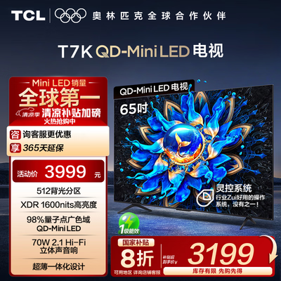 TCL电视65T7K电视机收到一周,画面非常清晰,送货,安装也很及时,态度很好,非常满意的一次购物英寸量子点屏幕色彩真实,高刷看球赛无拖影,+内存运行快,杜比音效震撼,这个价位真的值!品质很好,我很满意,推荐购买,质量有保证。顺丰到家,速度很快。电视不错,信奈TCL电视65Q9L Pro次旗舰电视,用过才知道有多好。用起来很舒服,亮度足够,特大特爽。和 的完美伴侣~希望明年能有寸。