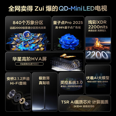 TCL平板电视 85英寸 QD-Mini 华星高阶HVA屏 万象分区 绚彩XDR2200nits 85T7L 含挂架安装 目前活动价:8699元!