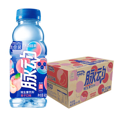 脉动脉动水蜜桃400ml15电商装 整箱迷你款的脉动,是有点可爱在身上的,我选择了雪柚橘子口味,味道非常好,价格也十分合适,一次囤了一箱,下次会回购的,值得购买。这个味的脉动还是头一回喝,不知道符不符合我的口味,反正试试吧,其它口味的脉动都很完美,味道比较清爽,炎热的夏季喝起来很舒服,不摆了一款运动型饮料,运动出汗后补充电解质。包装严实,送货超快,前一天晚上下单,第二天中午送到。味道很不错,买了青柠和雪柚两种口味,都很好喝。以前一直都是在实体店买,这次选择了网上买,不光是正品,价格还实惠!