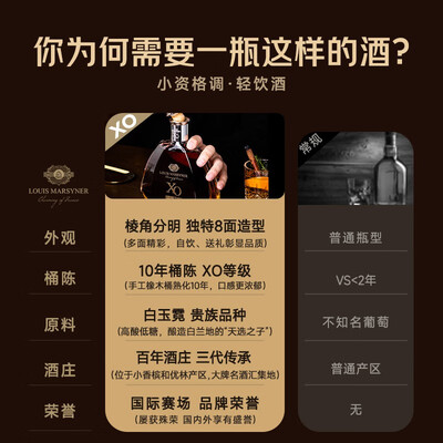 吐槽真相解密路易马西尼(Louis Marsyey)测评下质量如何?交流半个月感受分享!讲真心话这款路易马西尼(Louis Marsyey)法国进口洋酒 致胜 XO白兰地40烈酒礼盒装 单支700ml确实是非常OK的,首先,包装非常严实,速递非常快,基本上都是隔天到,客服也是比较热情,及时回答顾客疑问。酒在相似商品中价格实惠,性价比高,味道还不错,入口柔和不辣口,值得推荐! 一直舍不得买,活动价格实惠,买了好几瓶,慢慢喝,很不错的,而且没想到还有礼盒,出人意料,很好看,就是喜欢这个瓶子,加冰或者纯饮我很喜欢。 路易马西尼(LouisMarsyney)白兰地/干邑包装很完好,缓冲做得不错,打开丝毫无损,瓶子看起来高贵大气,,物流快,次日达,送货上门,非常满意!为京东、物流、快递师傅点赞!这款酒特意喝过再来评价!味道还不错,挺好喝的,价格还可以!喜欢白兰地的是很好的选择,外观也很好看!