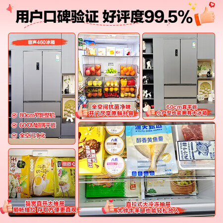 看保鲜技术两款都下了功夫。460升用的是全空间四维净化,杀菌率号称有99.9%。实际用下来确实没什么异味,绿叶菜放一周还是脆生生的。437升主打的是蓝光SPA养鲜,模拟自然光环境。用户反馈说草莓蓝莓这类娇气水果能多存两三天。要是常买高端水果的可以考虑这个功能。两款都有干湿分储,但460升的湿度控制更精细些,有三档可调。