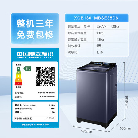 海尔(Haier)小红花波轮洗衣机全自动家用13KG超大容量手搓2.0免清洗XQB130-MBSE35D6直驱变频一级能效紫外杀菌目前活动价:?9?元!