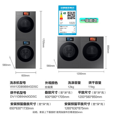 三星(SAMSUNG)AI神洗烘套装9系 12+11KG超薄嵌入亲宠衣物护理大屏操控黑 WW12DB9B84GDSC+DV11DB94A0GDSC目前活动价:?9?元!