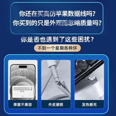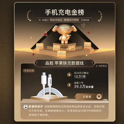 品胜(PISEN)数据线苹果手机充电线又脆又不耐用,还死贵,用品胜做替代就是很不错的选择,经济实惠耐用。家里用的苹果线ipad的手机的老婆用的全部都是品胜品牌,已经不知道是第几次回购了,特别是1.8m的,长一点更加好用,可以从床这头到那头,躺床上玩手机可以随便动,很方便数据线非常不错,品质好,包装棒,说明书齐全,用起来顺心,买起来放心,送货上门速度快,价格优美下次再来。做工质感:做工精良,没有毛毛糙糙的感觉。充电速度:充电速度很稳很快接口类型:ctoc的pd快充发热程度:轻微发热,可以接受