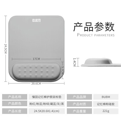 BUBMJSM-B慢回记忆棉护腕鼠标垫商品符合描述,主要是活动便宜,能省很多钱......这个鼠标属于人体工程学范畴之内的设计用起来比较舒服按了下有记忆海棉,如果海棉再高一点就好了性价比高,质量真的好,五星好评。送货也很快!京东一直给力!