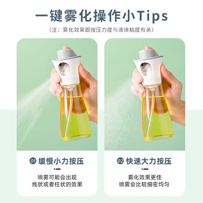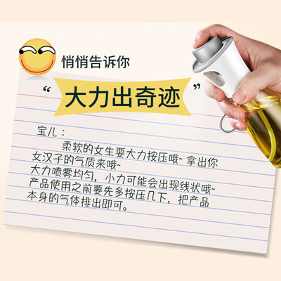 比新OBAPYP180ML-KABAI前段时间买了空气炸锅,这个喷油壶是空气炸锅的比配用品。厨房菜鸟也能做大餐这个小壶很可爱的样子,放厨房也特别合适看起来挺精致拿在手里很有质感,感觉性价比不错,装水清洗的时候试了一下,喷出来是扇形雾化的,挺实用的。喷油瓶拿在手里质感特别好,喷出来的油均匀,特别好用,好评哦油瓶到货很快,瓶身是玻璃的,很好灌进去,喷出的油很均匀,一次出油不多,正好满足少油健康的需求,买喷油壶的作用就是减少用油量。感觉很好用。