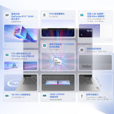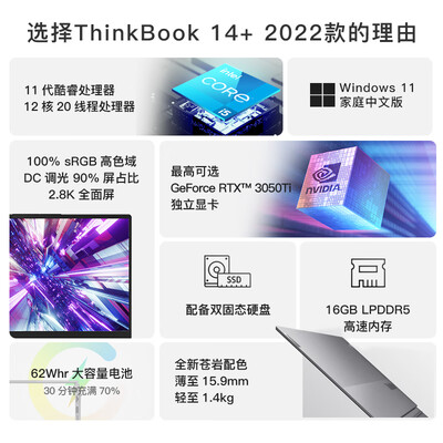联想ThikBook 14+ 英特尔酷睿i7 14英寸标压高性能轻薄笔记本电脑i7-12700H 16G 512G RTX2050 2.8K 90Hz到手价格7399.0元。