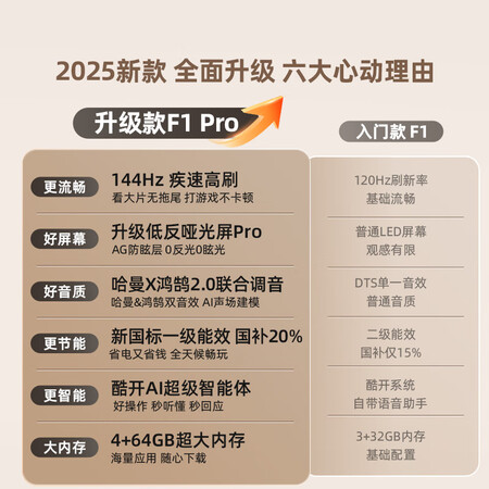 F1 Pro首发价4999元,定位中高端;F1目前促销价3699元,性价比突出。若预算充足且追求影音体验,F1 Pro更优;注重实用性的用户选F1即可。